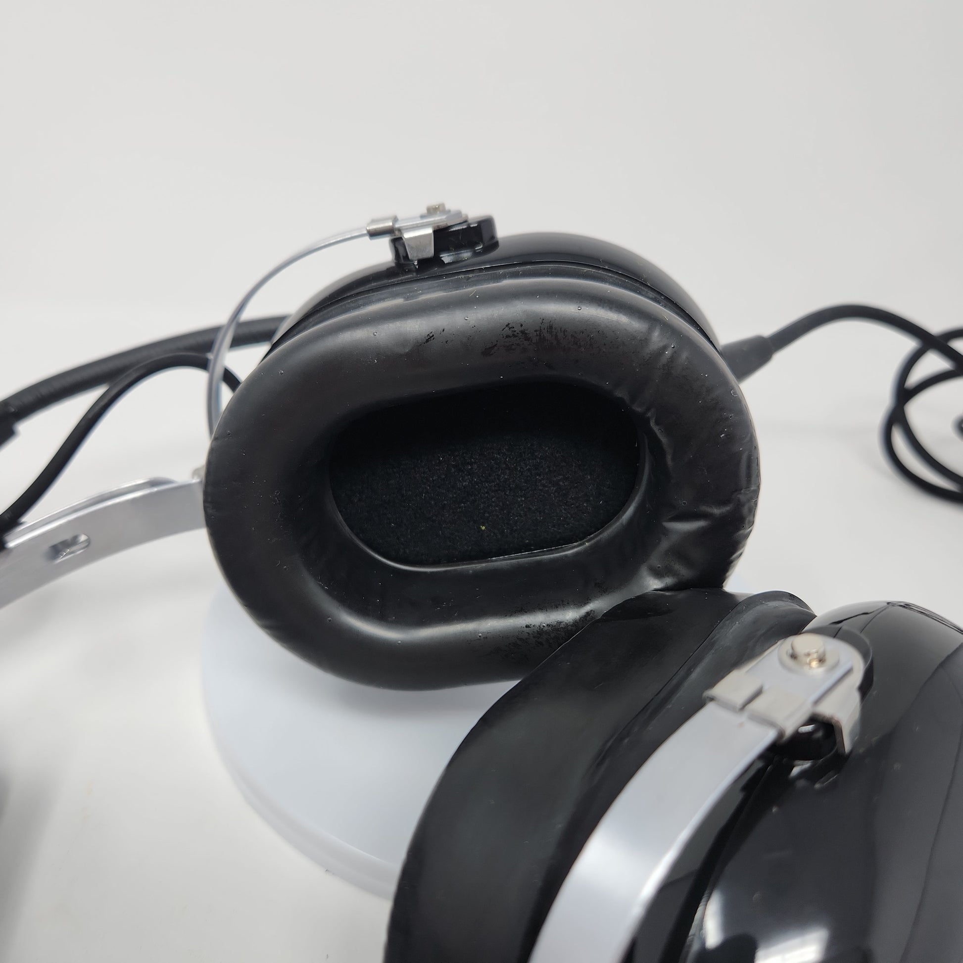 The ear cup housing is in good condition with no damage and minimal wear. The ear cup cushions are in good condition, clean and have no odor. The headband is in good condition with little to no wear. The buttons have no signs of heavy use or wear. The hinges are in good condition with minor signs of use. The ports are clean and in good condition. The earbuds are in good condition and clean. The wire is in good condition with little signs of wear.