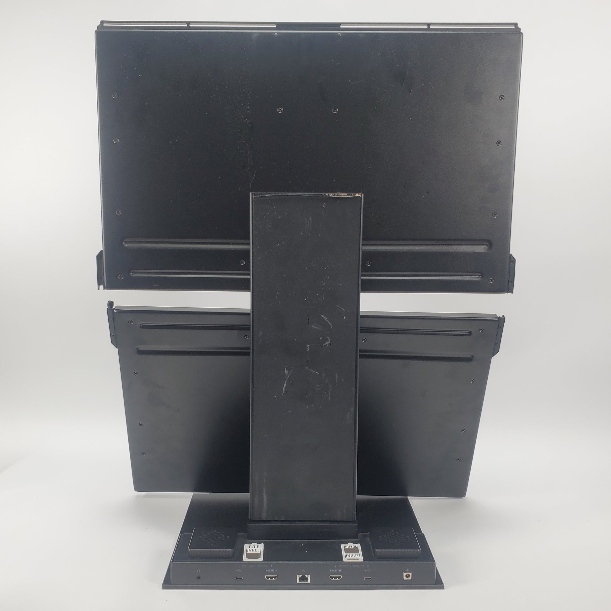 The hinges connecting the monitors are broken but the stand still functions. The screen is in good condition with some minor wear and scuffs. The back panel is in good cosmetic condition with minimal wear. The top of the stand is damaged. All of the ports are in good condition and clean. The stand is in good condition, sturdy and functioning properly. Please view our close up photos, as these are taken of the actual item being offered for sale.